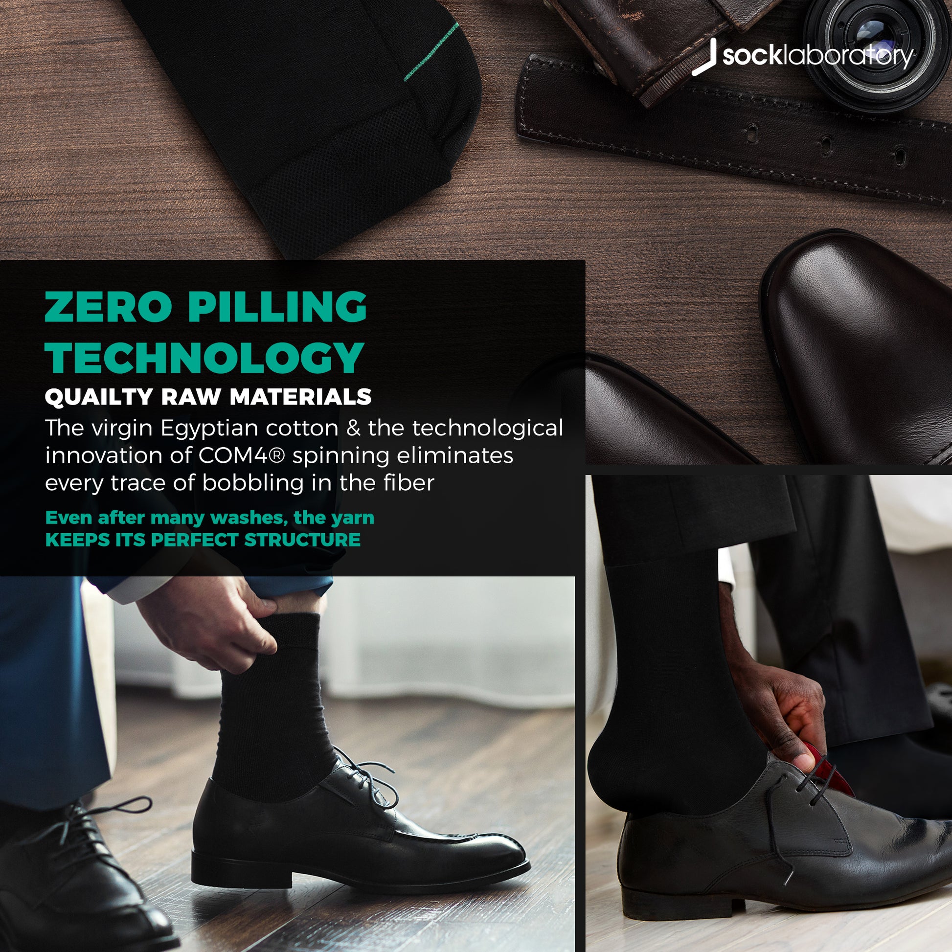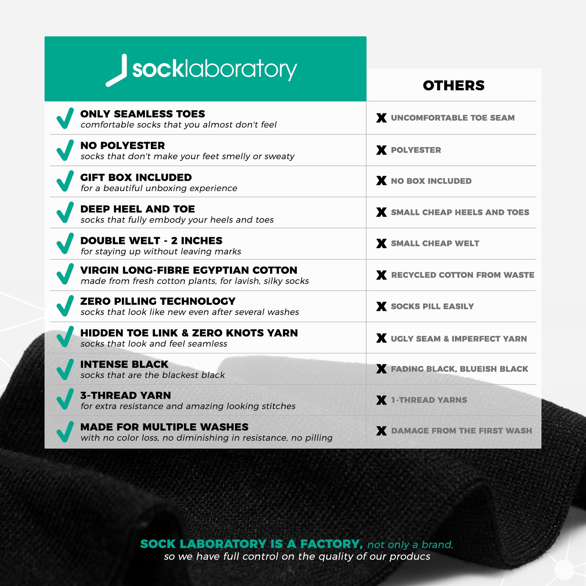 Socks may seem not review worthy, however I have been looking for a black sock like this for years. I don't like thick socks. Sock Laboratory socks are thin but not sheer. Can be worn with sneakers, loafers or oxfords without looking wrong. These socks feel good. They are tight enough to stay up without strangling my ankles. Nice, dark black color with a (sexy) green stripe across the toe. I feel sexy wearing these socks. Highly recommend getting a box!